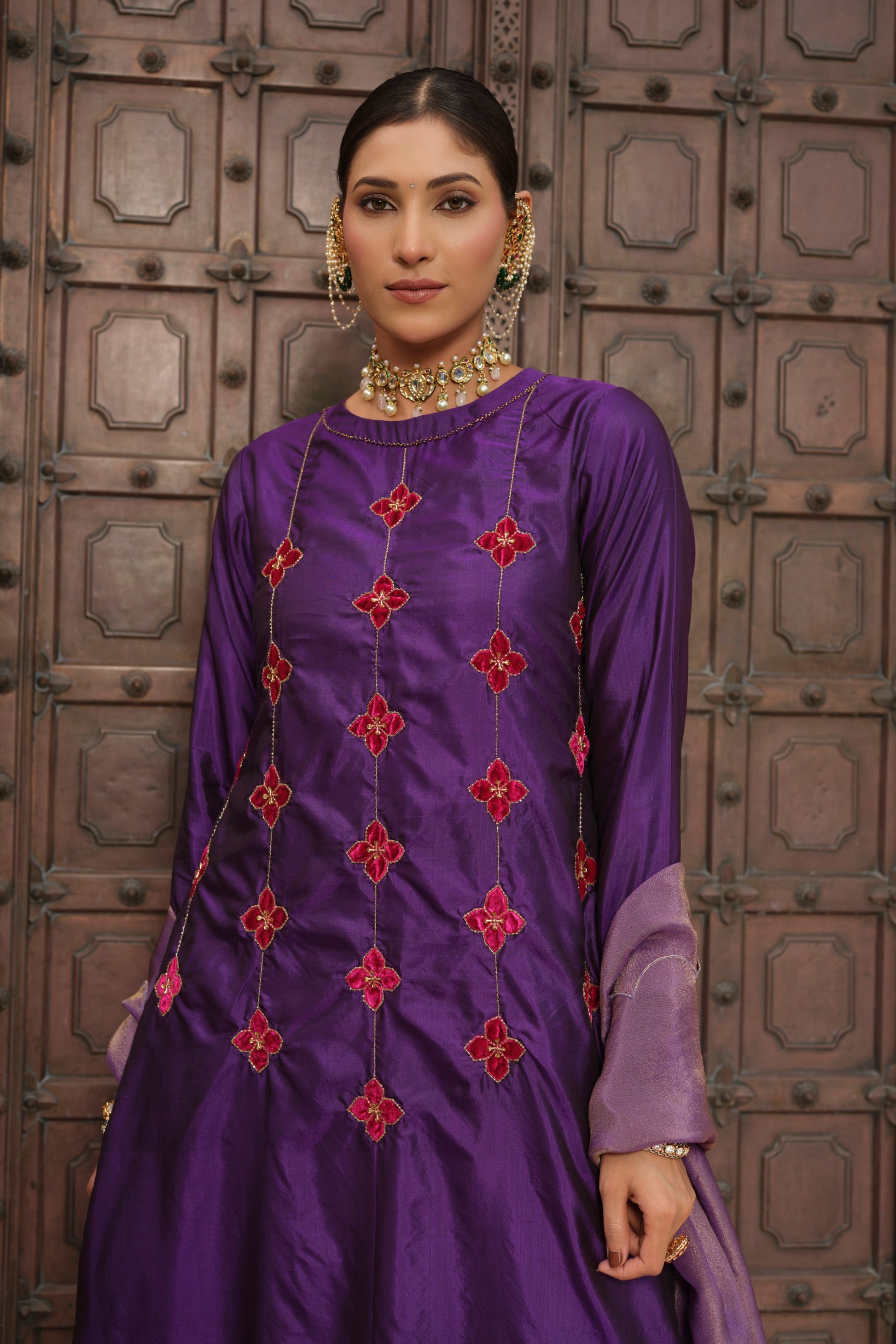 The highlight of this piece is the velvet appliqué motifs—placed in a rhythmic, lattice-like pattern across the front—each one hand-embellished using fine zardosi and aari embroidery.