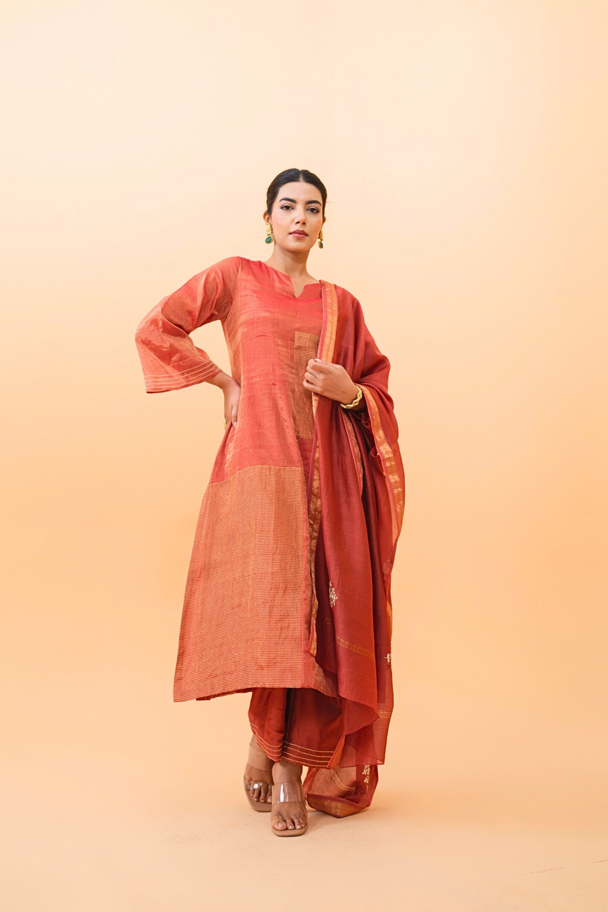 In a vibrant rust hue, Autumn Glow is a celebration of warmth and elegance. Crafted from luxurious tissue Maheshwari fabric, this kurta features intricate zari weave panels that add a touch of refinement. The notched round neck and delicately flared 3/4th sleeves offer a relaxed, flattering silhouette, while the A-line shape ensures comfort and movement