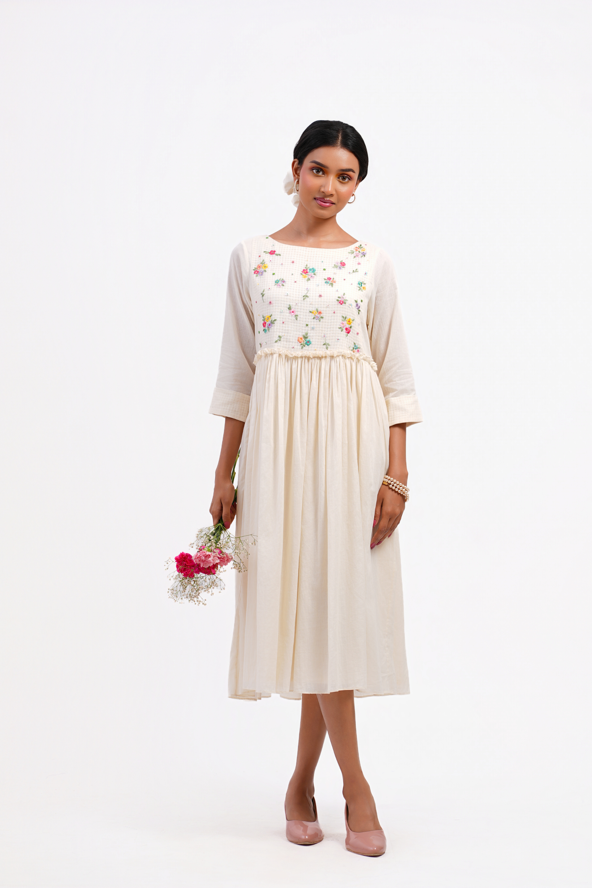 Signature fit and flare mulmul dress with an embroidered yoke, waist gathers and soft calf-length silhouette. Designed for ease with gentle flare and comfortable 3/4th sleeves; fully lined.