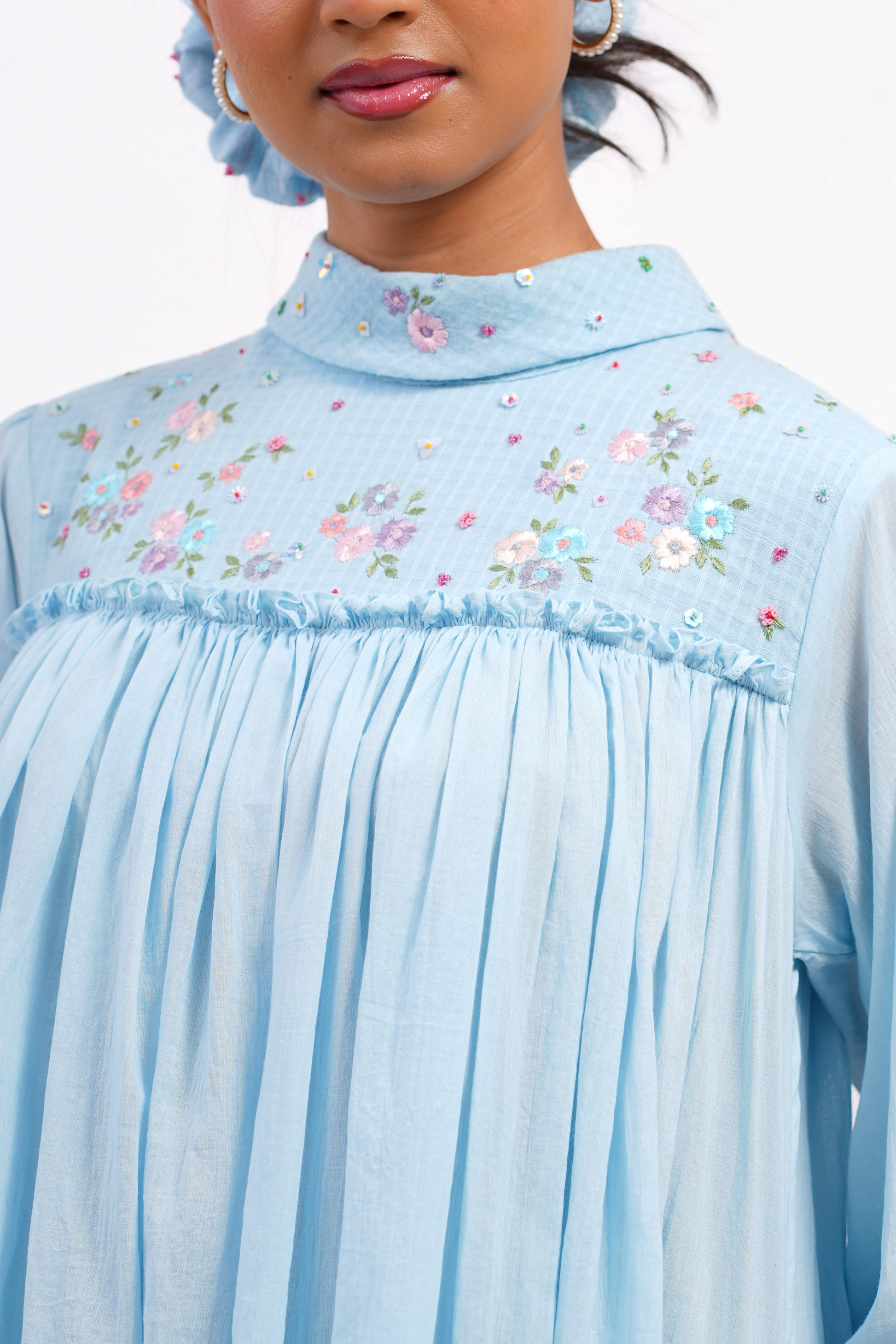 Relaxed fit mulmul dress with a delicately embroidered floral yoke accented with sequins and a soft frilled band collar. Gentle gathers fall from the yoke into an airy flared silhouette with easy three-quarter sleeves; fully lined.
