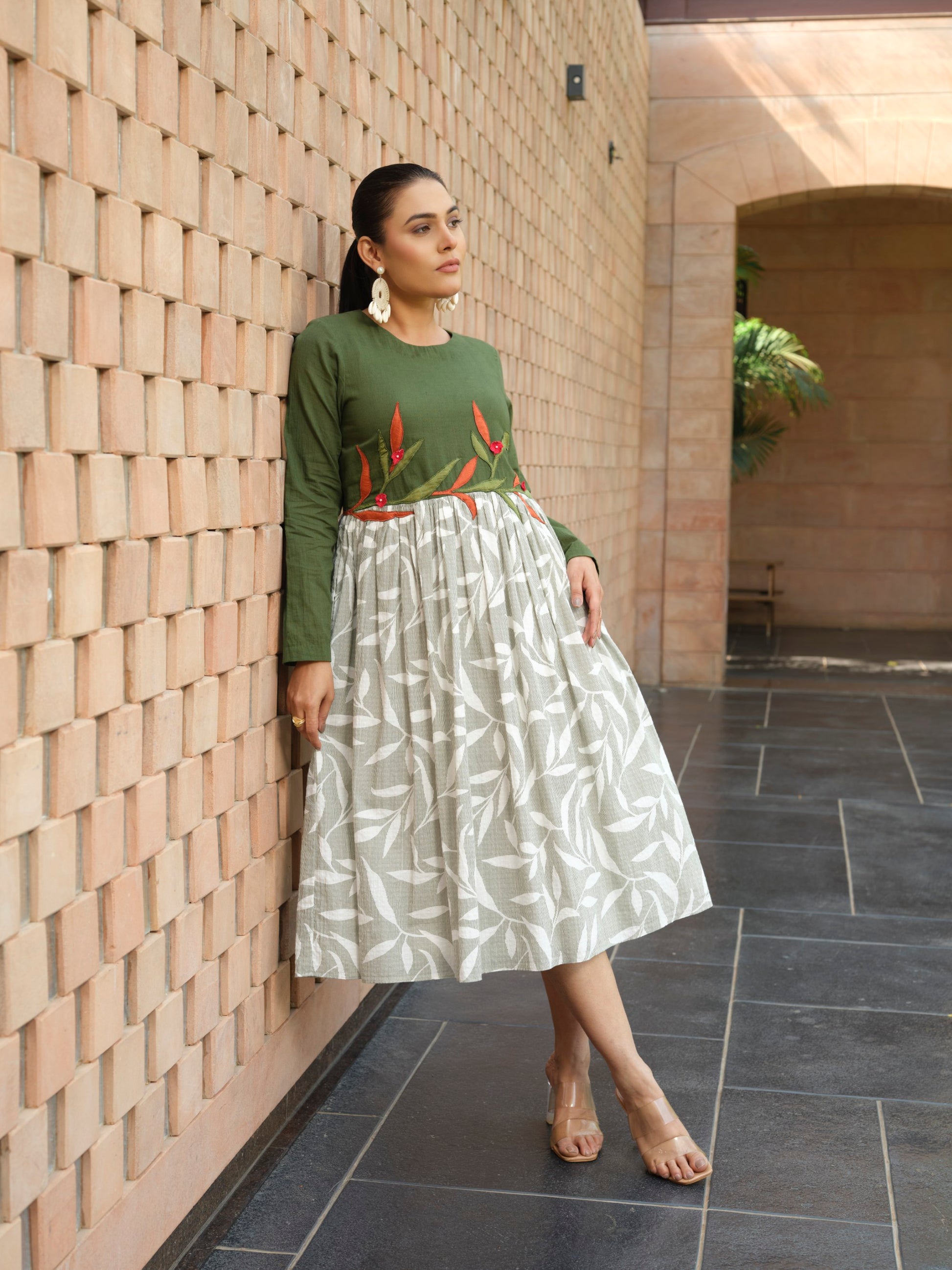 A cotton dress designed in a relaxed, easy silhouette with a softly gathered waist and a printed leaf-motif skirt. The bodice features chanderi patchwork in dark sage and rust orange, highlighted with hand-applied 3D floral details finished with delicate pearl drops at the centre. Comes with an attached mulmul liner for comfort, functional side pockets, and a back keyhole closure with button.