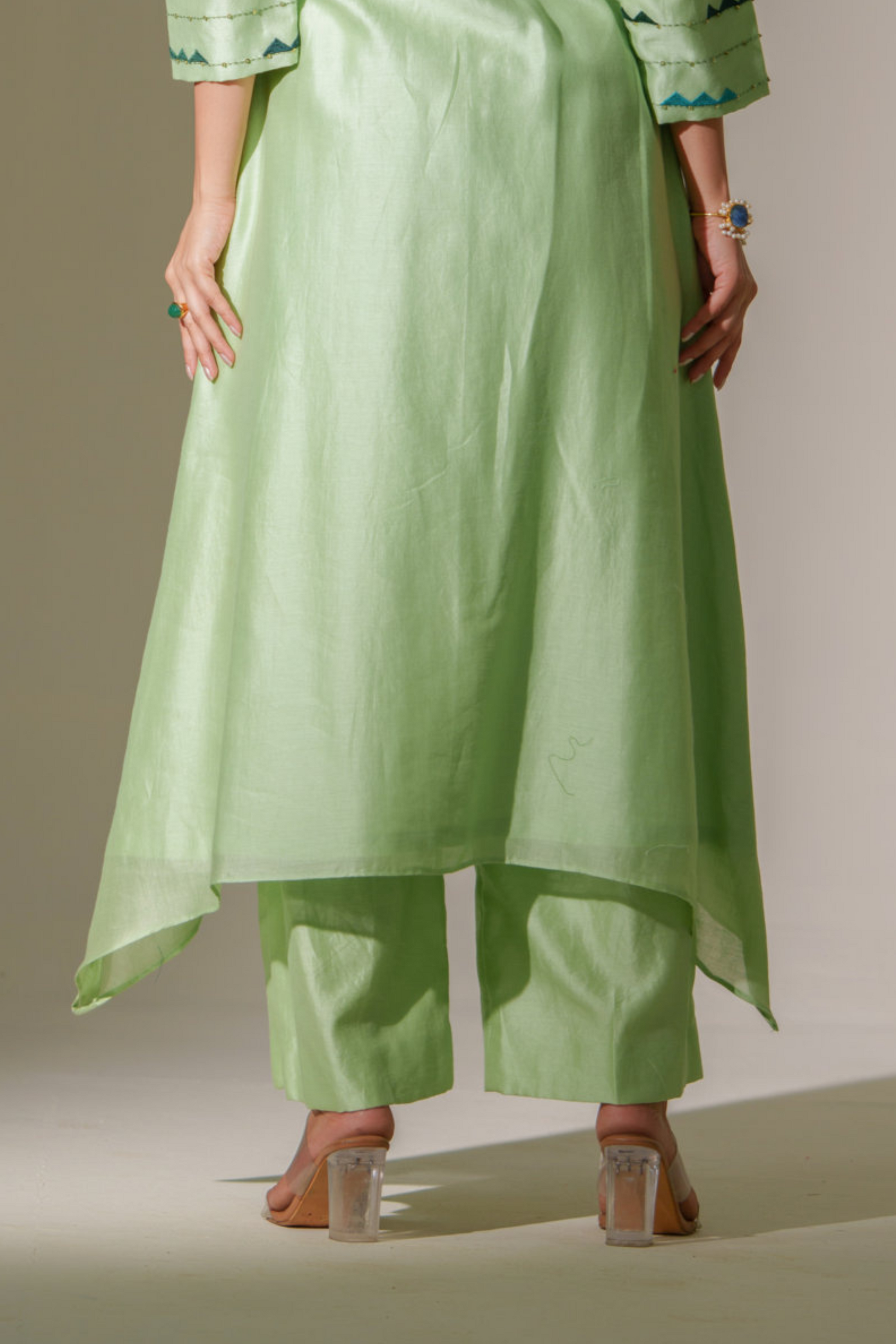 A relaxed pair of pants that’s designed to fit seamlessly. Crafted in rich chanderi, these pants are mindfully crafted in a beautiful hue. Features slightly flared hemline and a half-elastic half-belt waist band.