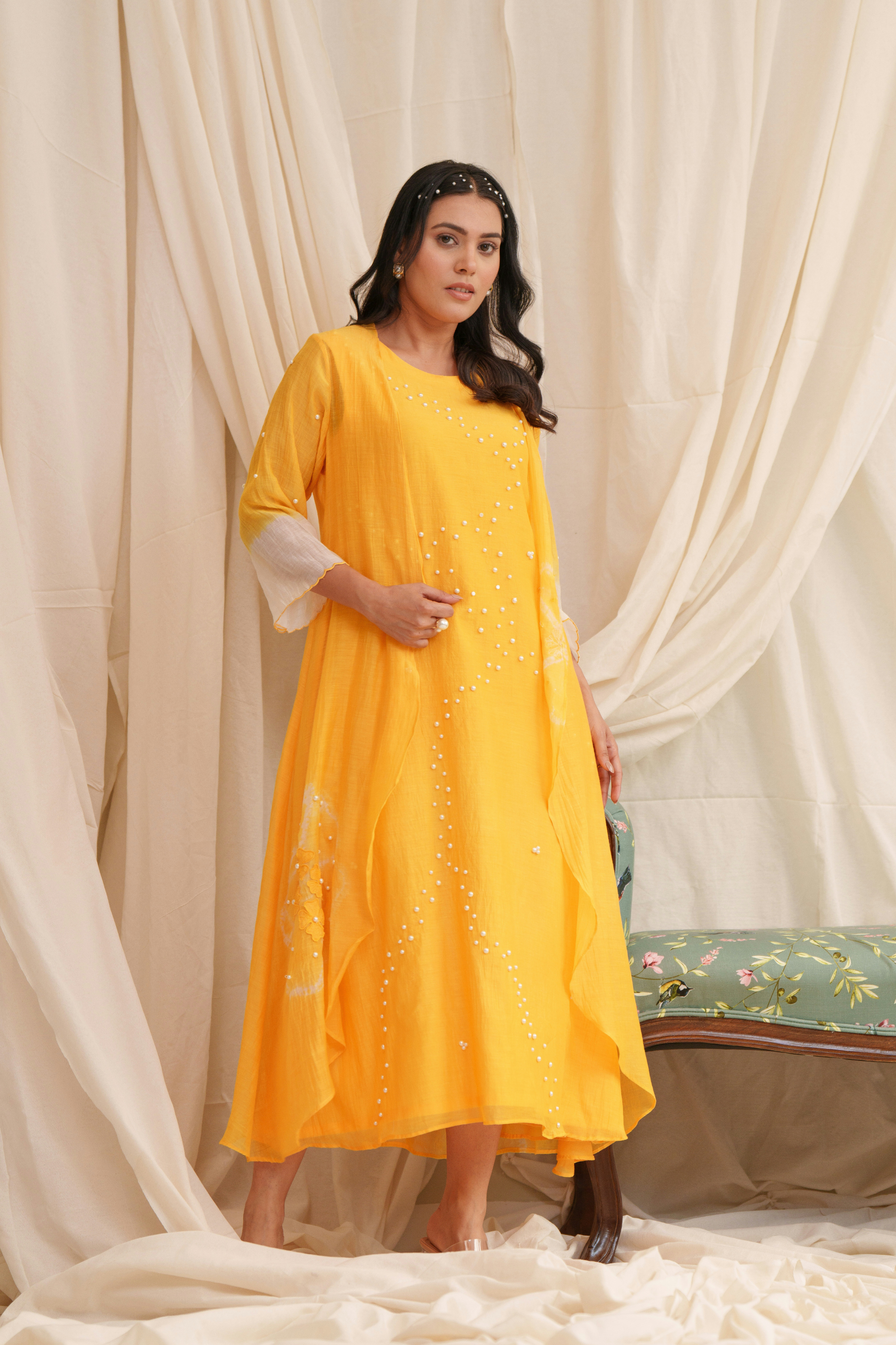 A standout two-piece set in cotton chanderi, featuring a sleeveless inner slip and a breezy, front-open jacket with ombré sleeves and a soft round neckline. The silhouette flows with airy elegance, adorned with exquisite pearl embroidery and subtle hand-dyed shibori patterns that catch the light with every step. The golden marigold hue radiates warmth, joy, and celebration.