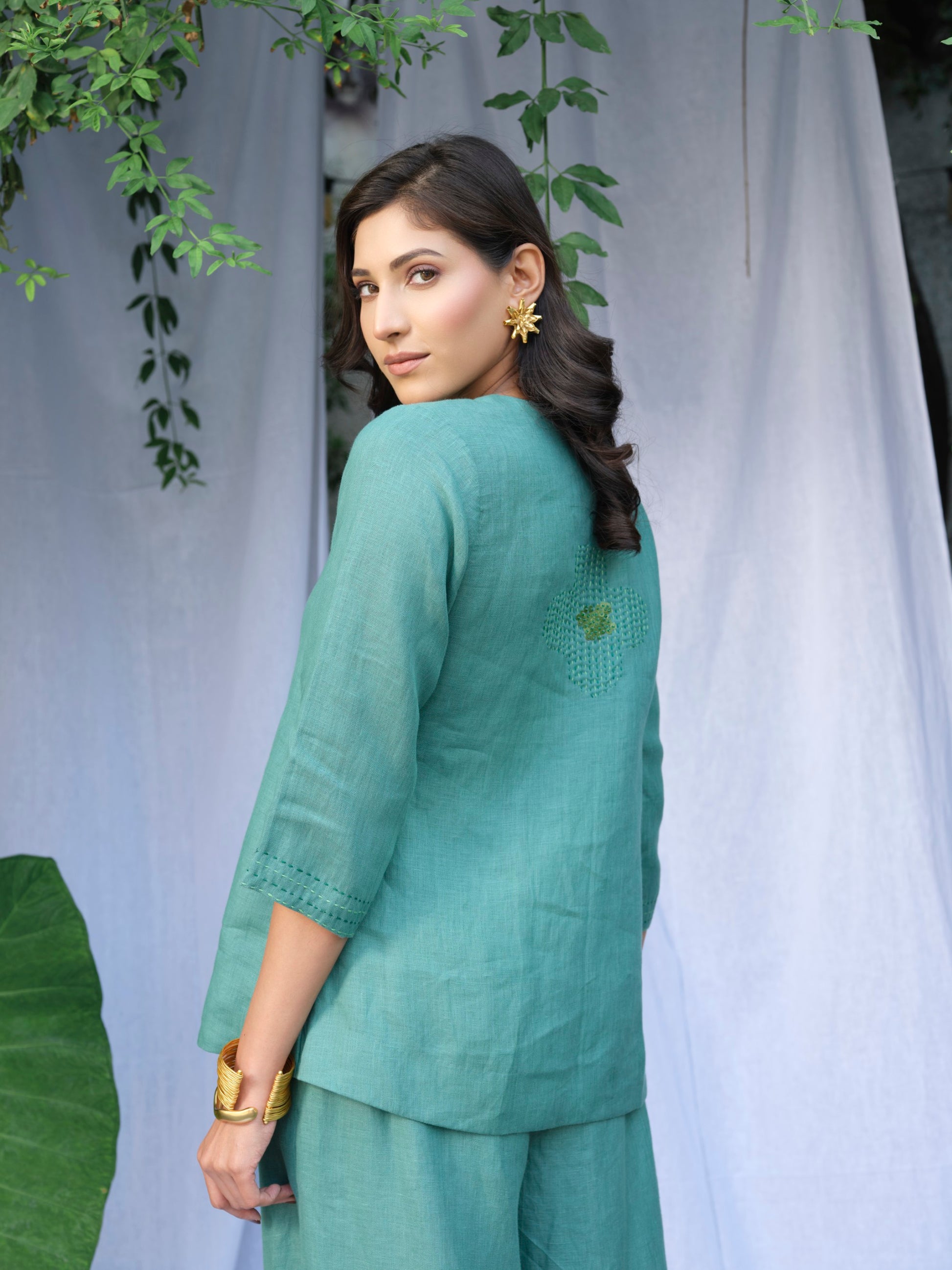 A pure linen top with a clean, curved hemline, structured front panel, and relaxed sleeves. Finished with subtle tone-on-tone kantha embroidery and delicate sequin accents placed thoughtfully across the front for a soft, handcrafted touch. The fit is easy, refined, and fuss-free.