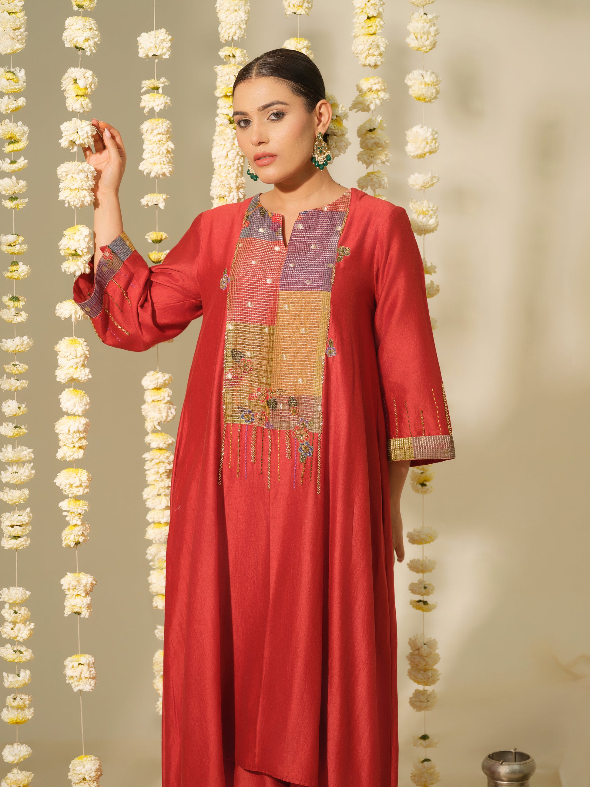 Crafted in fine handloom Chanderi, the Nandini kurta features a rich vermilion red hue and a flowing, relaxed silhouette. The standout feature is its waterfall hemline, which drapes gracefully to add a touch of fluid movement. The front panel showcases multicolour patchwork in tissue organza, beautifully highlighted with delicate hand embroidery. A soft keyhole neckline and hand-detailed sleeves finished with zari accents lend the piece a refined festive edge.