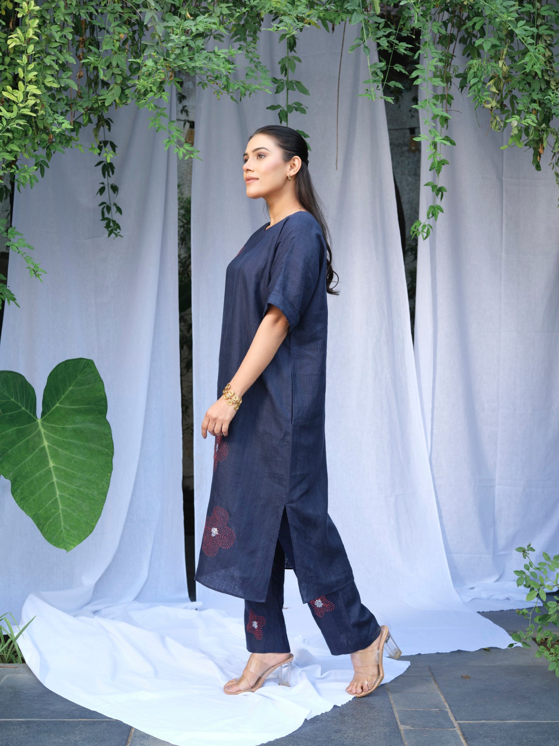A relaxed-fit pure linen kurta in a reglan-cut silhouette for seamless comfort, featuring a round neck, short sleeves, a side pocket, and scattered tone-on-tone hand embroidered kantha work floral motifs highlighted with subtle sequins. The flow is straight and easy, designed for all-day wear.A quiet elegance runs through its stitched florals which is simple, grounded and softly expressive. Perfect for work, slow evenings, or days when you want comfort without compromise.