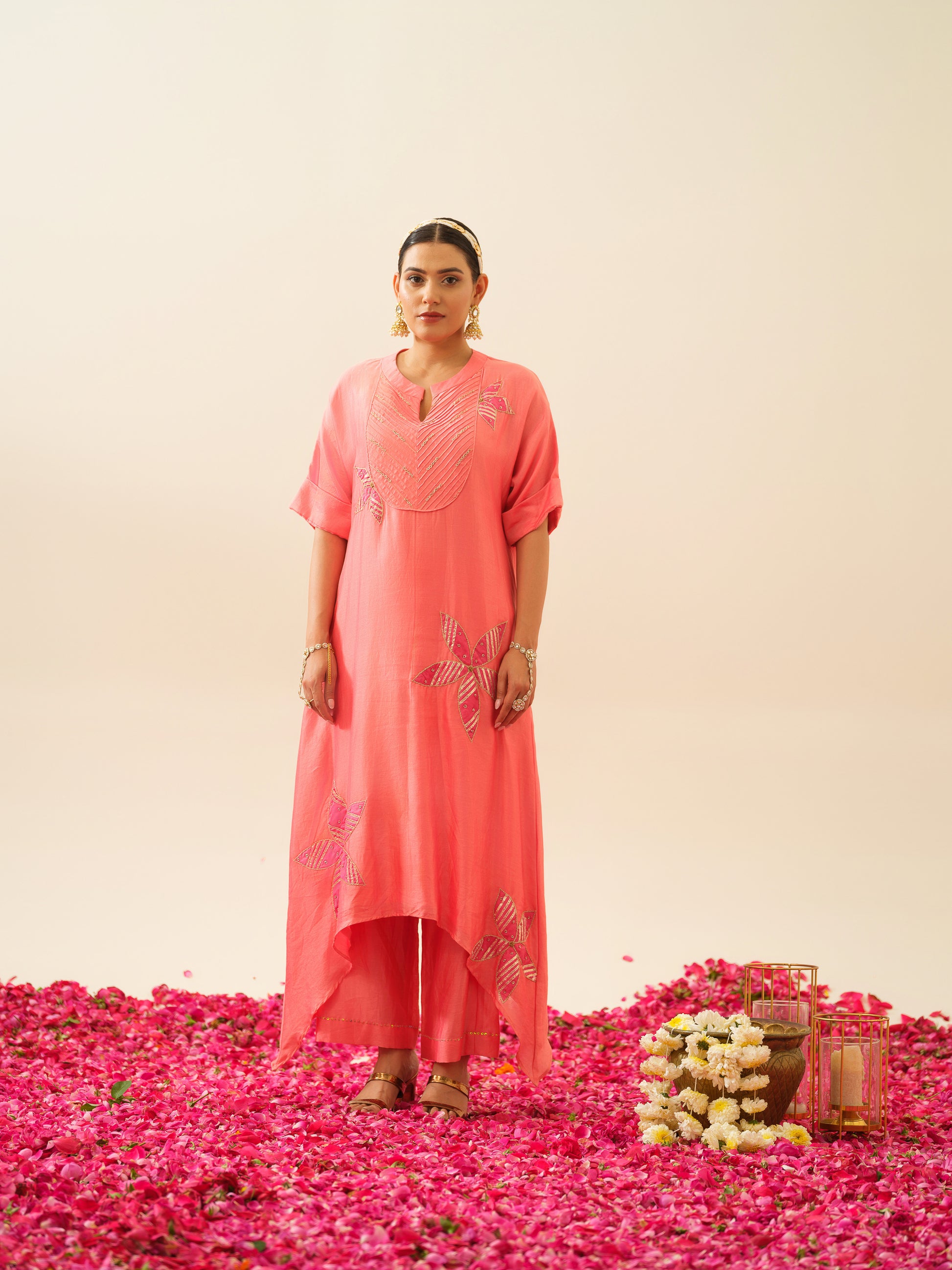A free-flowing Chanderi kurta in an extra relaxed silhouette made to move with you and let you breathe easy through long festive hours. The softly curved neckline opens into a delicate slit, leading into a hand-embellished chevron-patterned gota patti yoke, with floral gota appliqué scattered like poetry across the fabric. Roll-up sleeves and an asymmetric waterfall hemline add gentle movement and charm.
