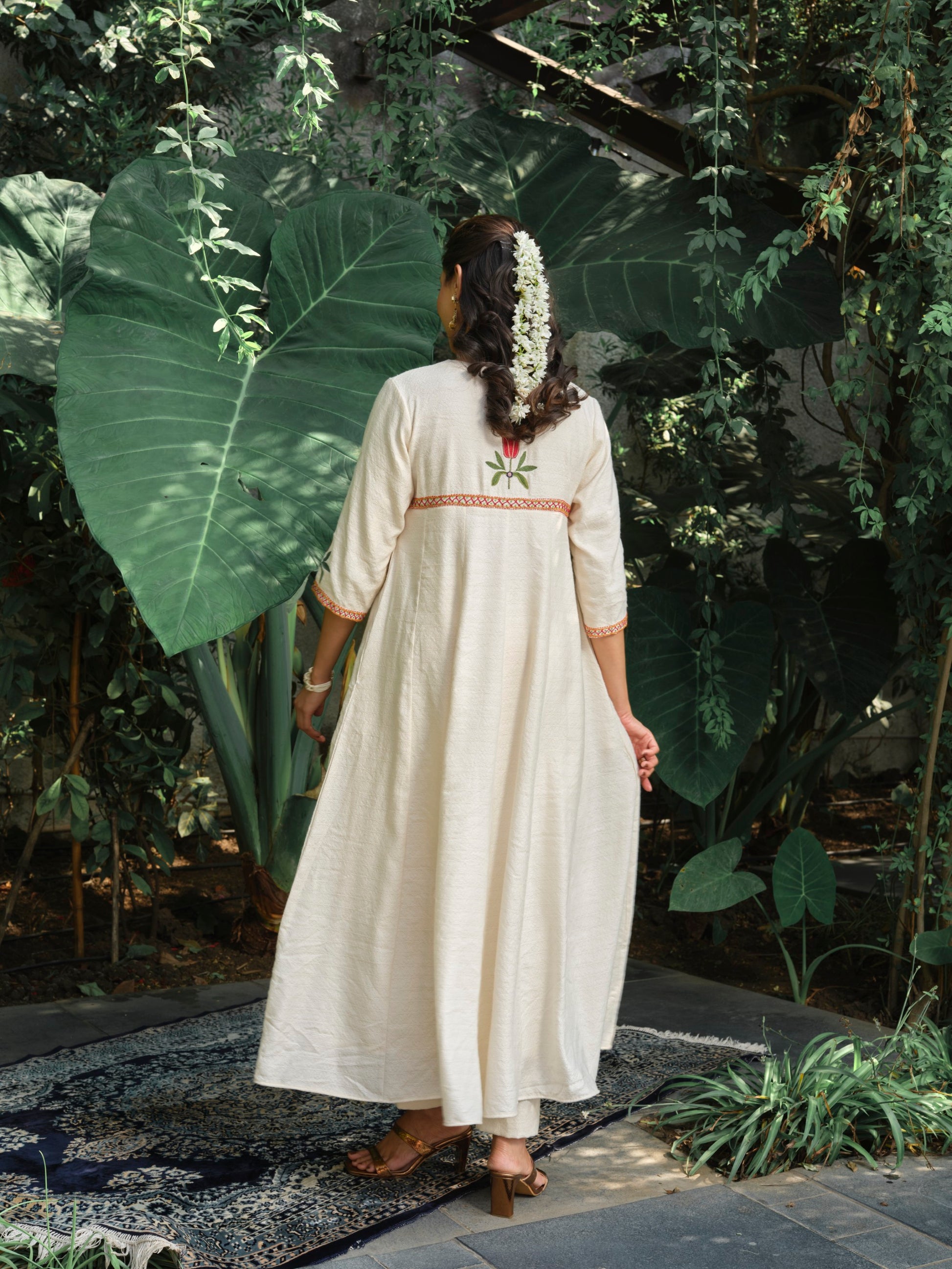 Features a round neckline detailed with Chanderi appliqué and fine mirror work. Hand-embroidered floral motifs adorn the yoke and sleeves, with smaller motifs scattered towards the hem for balance. The sleeve hems are finished with Chanderi appliqué detailing, adding a subtle contrast in texture and sheen.