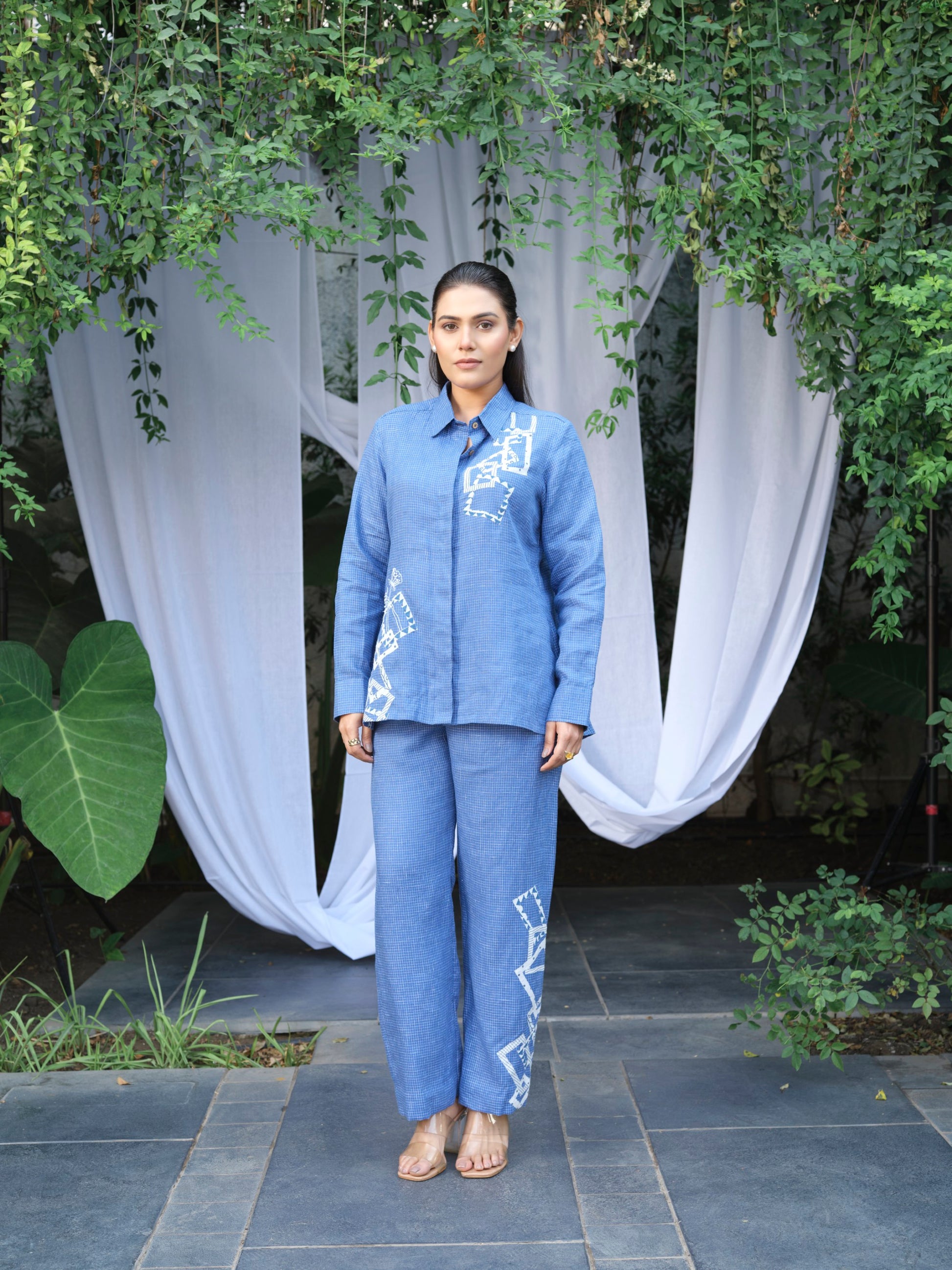 This Co-ord Set includes the Rome Shirt and Rome Pants, both crafted in breathable pure linen with subtle geometric appliqué. The shirt features a button-down front, full sleeves, and a classic collar, while the pants offer a mid-rise, tapered fit with a half-belt and half-elastic waistband.