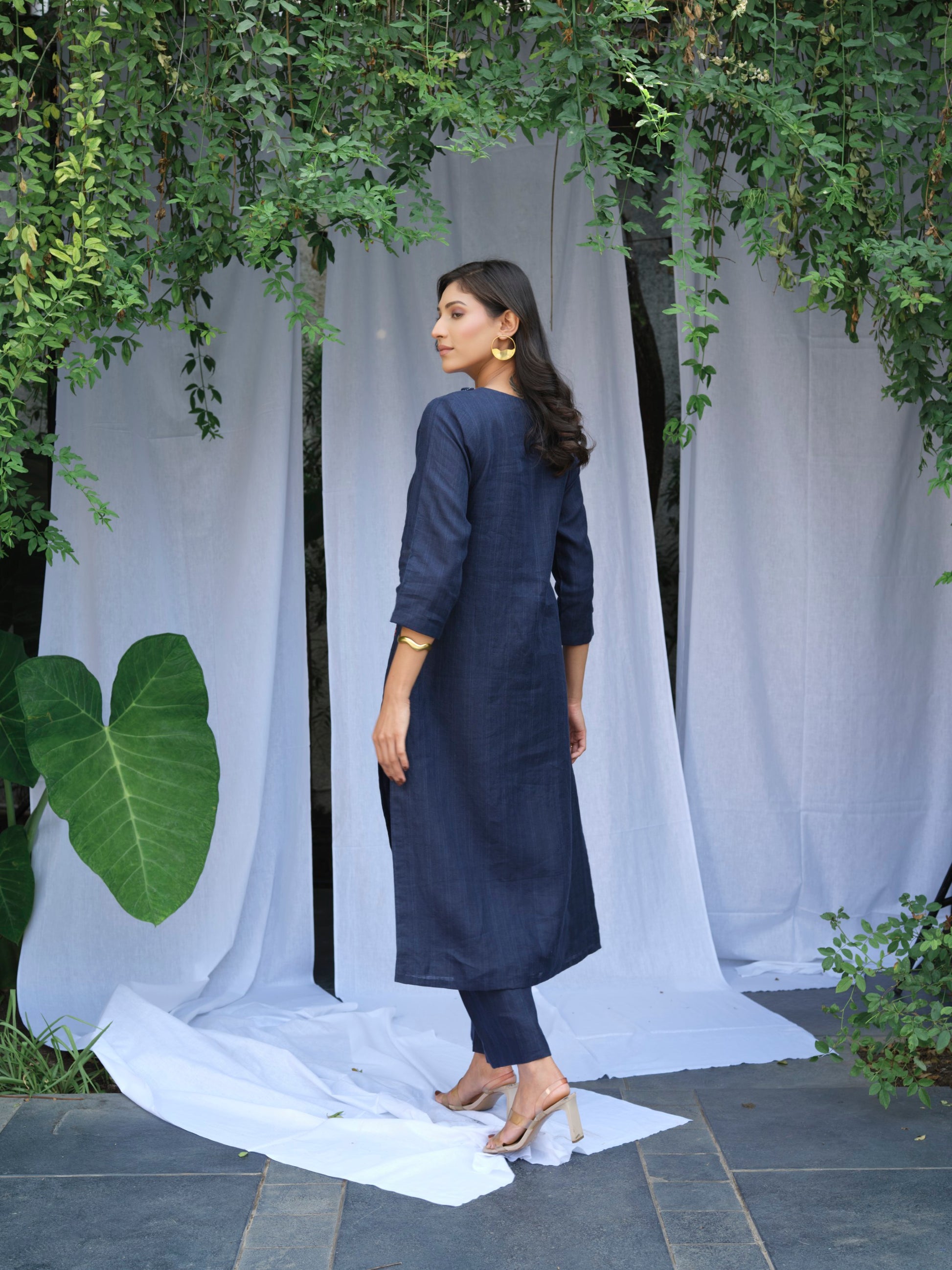 A pure linen kurta featuring flowing, kantha-inspired line embroidery that traces the front in soft, wave-like patterns. Accented with a handcrafted floral motif near the hem and a touch of embroidery at the shoulder. Finished with a wooden button on one side of the neckline for an earthy detail. The silhouette is straight, relaxed, and easy to pair.