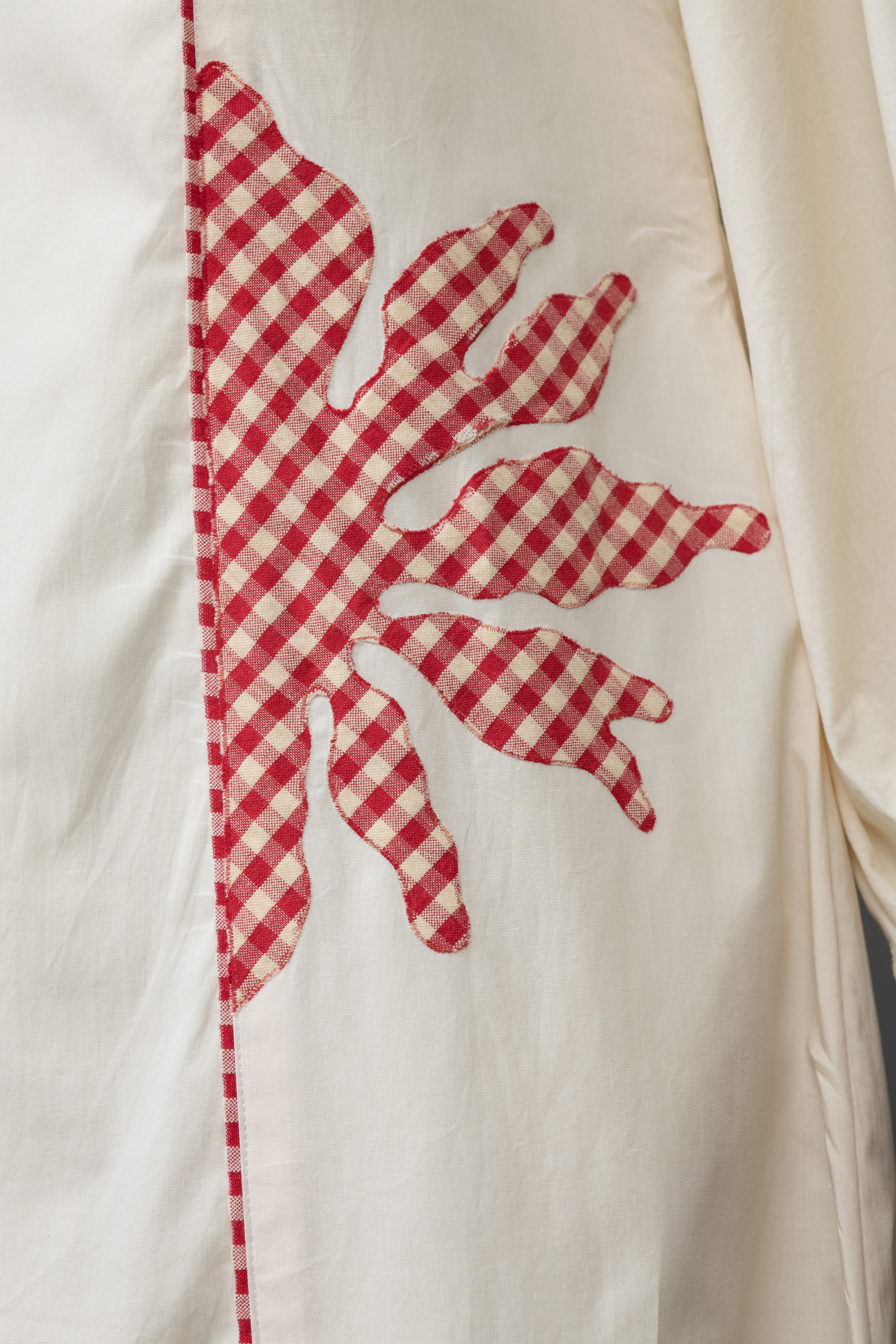 An easygoing ivory cotton dress, highlighted with red checks appliqué detailing along the sides.