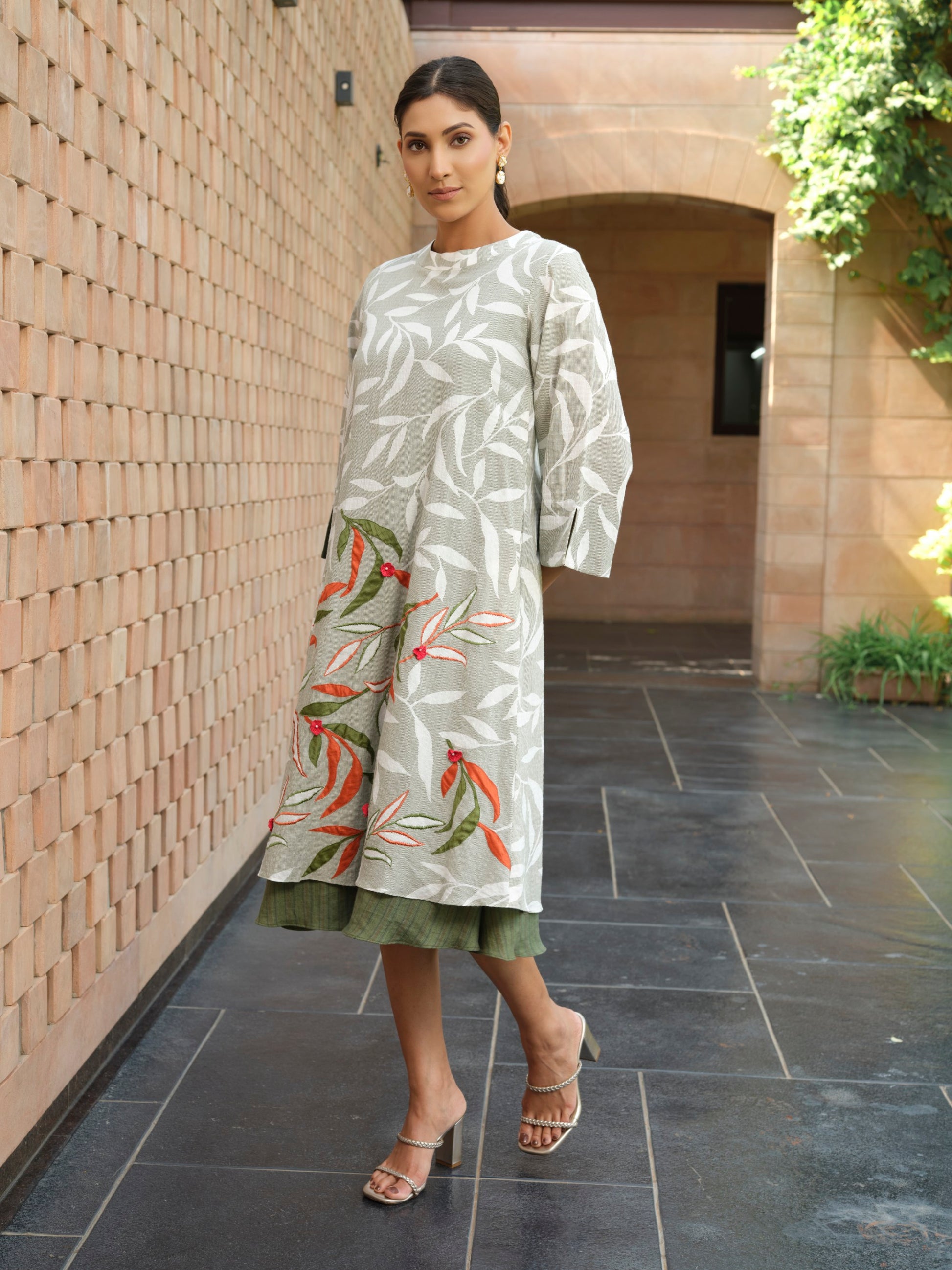 An easy, thoughtfully constructed dress designed for everyday elegance. The Twigs Dress features a double-layered silhouette — a printed cotton outer layer paired with a soft inner layer that adds gentle volume and movement. Designed with a clean canvas round neckline and a relaxed, easy fit, it offers comfort without losing shape.