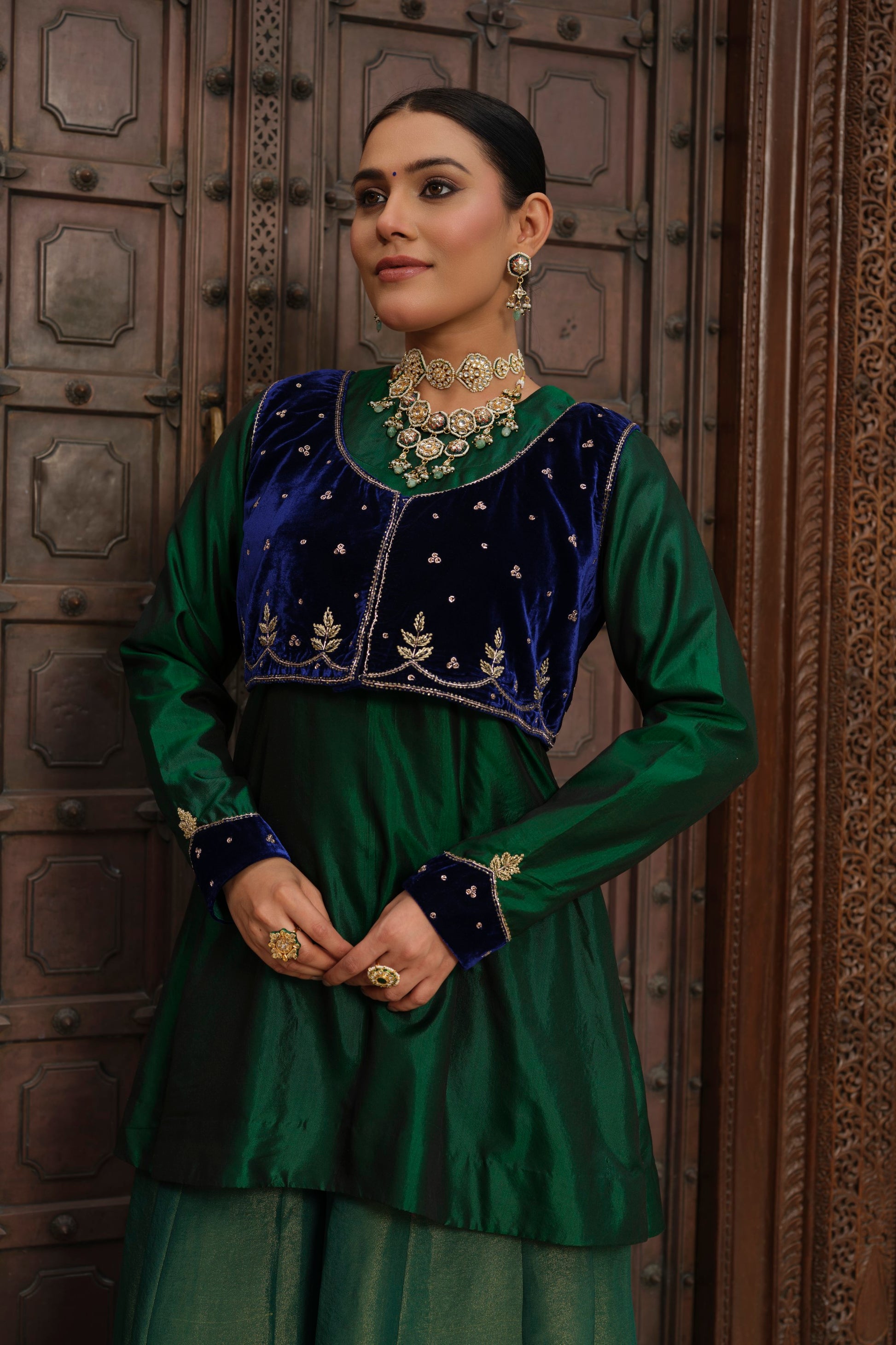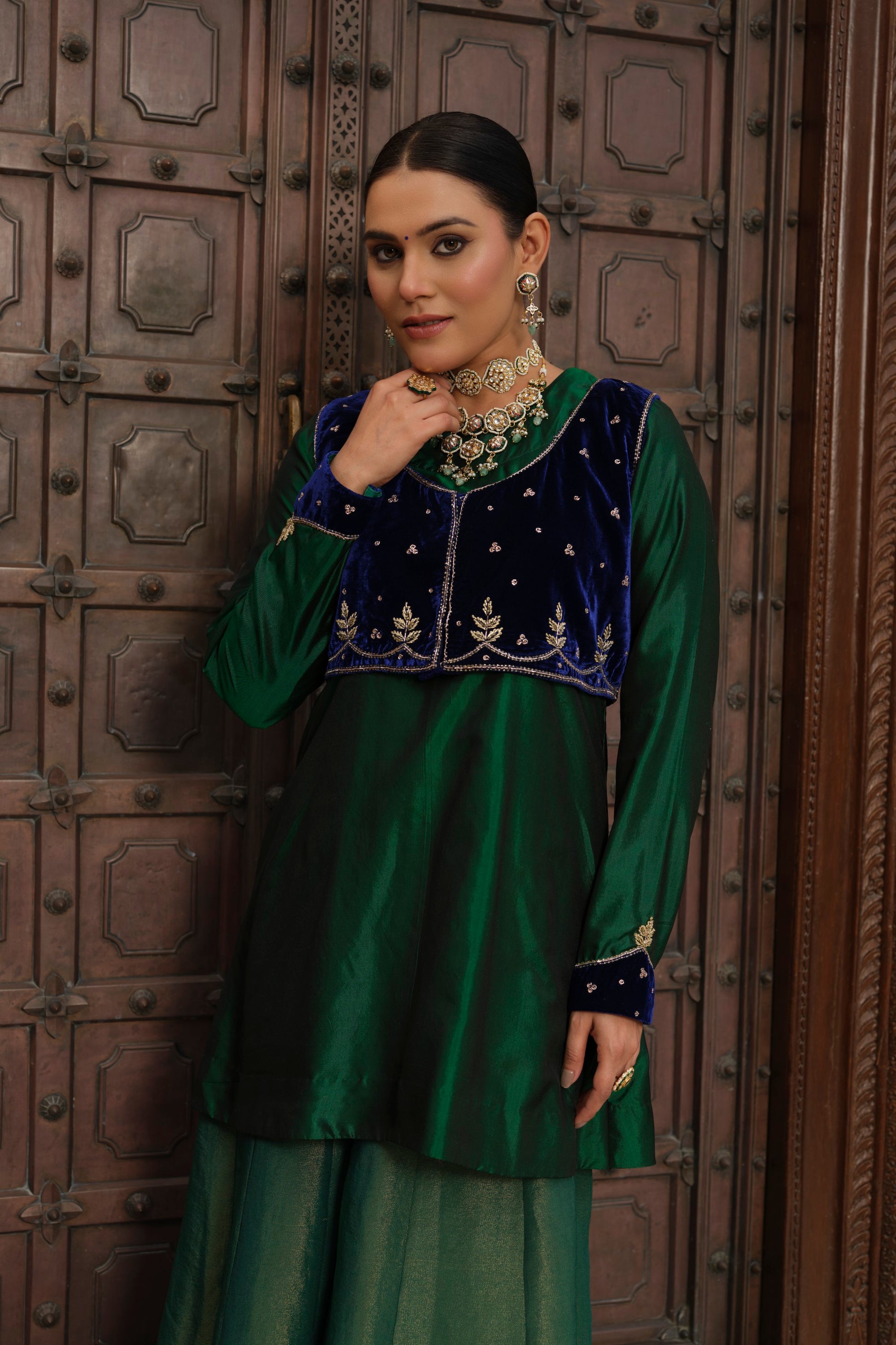 A signature piece from our Ishq collection, the Uns jacket is crafted in rich midnight-blue velvet and finished with intricate zardosi and aari hand embroidery — a beautiful balance of texture, sheen, and artisanal detail. The cropped silhouette sits elegantly over kurtas and dresses, adding regal structure without overpowering your look.