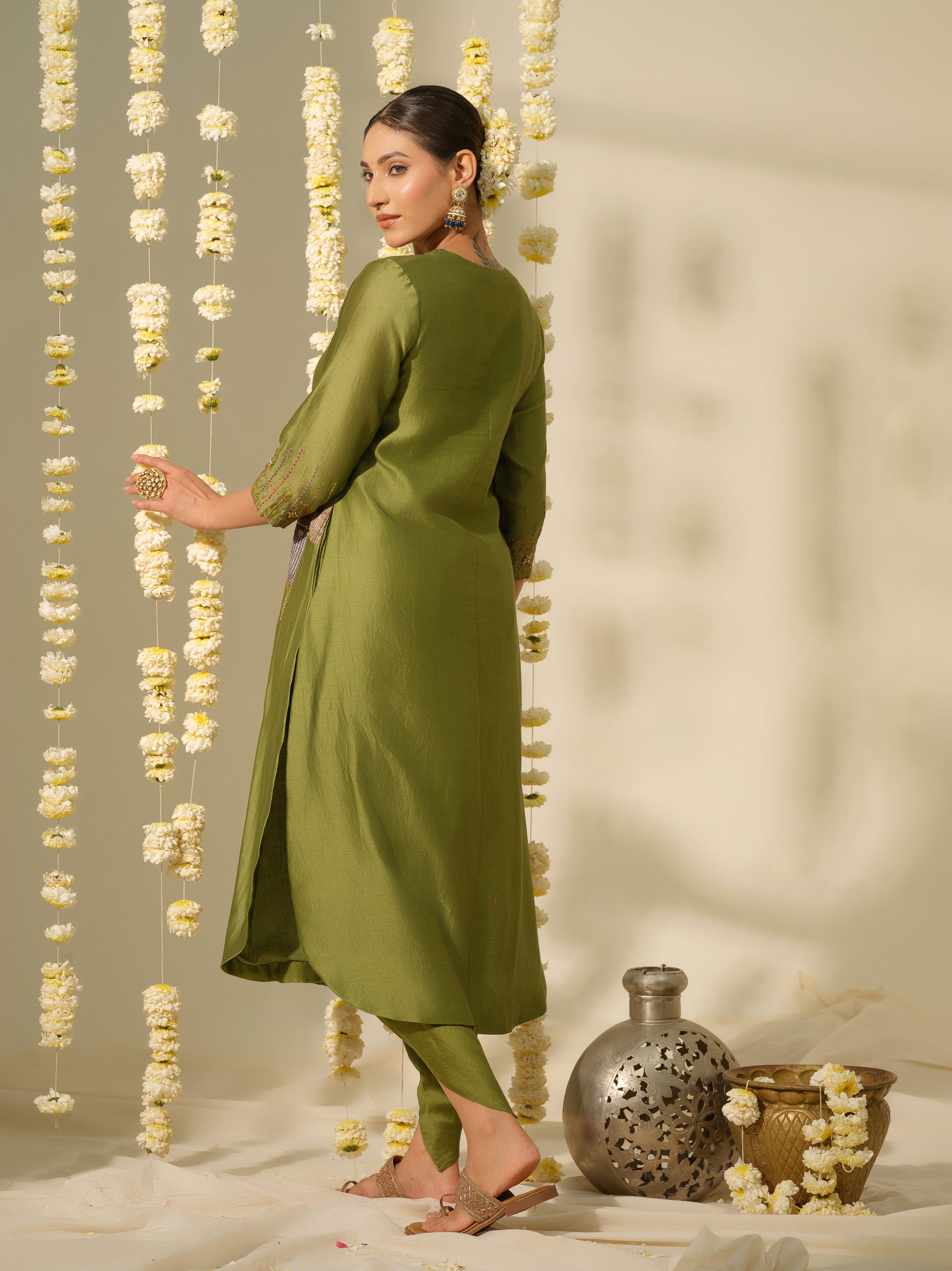 Woven in handloom Chanderi, the Vasant kurta comes in a refreshing olive green, bringing a natural calm to festive dressing. The silhouette is relaxed with a soft, notched neckline and three-quarter sleeves, each delicately hand-embellished with bead and thread work. The front features multicolour patchwork in tissue organza, enhanced with floral embroidery and scattered mirror detailing. An apple-cut hemline adds a subtle twist to the classic straight kurta, offering graceful movement and an easy drape.