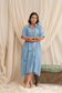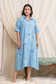 Tailored in cotton chanderi, this breezy shirt dress features an oversized relaxed fit, a collared neckline, and a gently flared hem. The sleeves are crafted in a dolman cut offering natural ease and movement. Pearl embroidery sits delicately across hand-dyed shibori patterns in soft powder blue, with floral accents scattered thoughtfully.